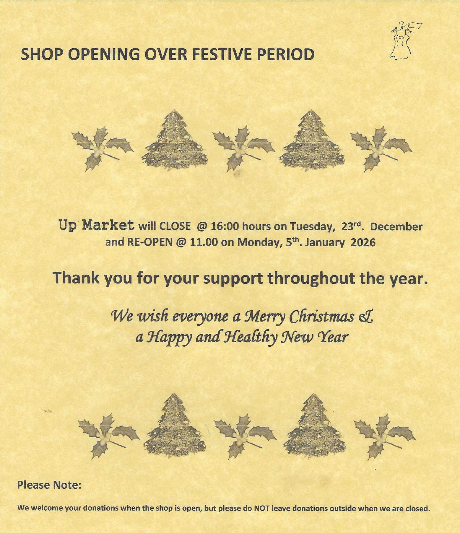 Up Market accepts saleable donations Tuesday to Saturday 10:30 'til 3.30. Up Market is unable to accept electrical items.